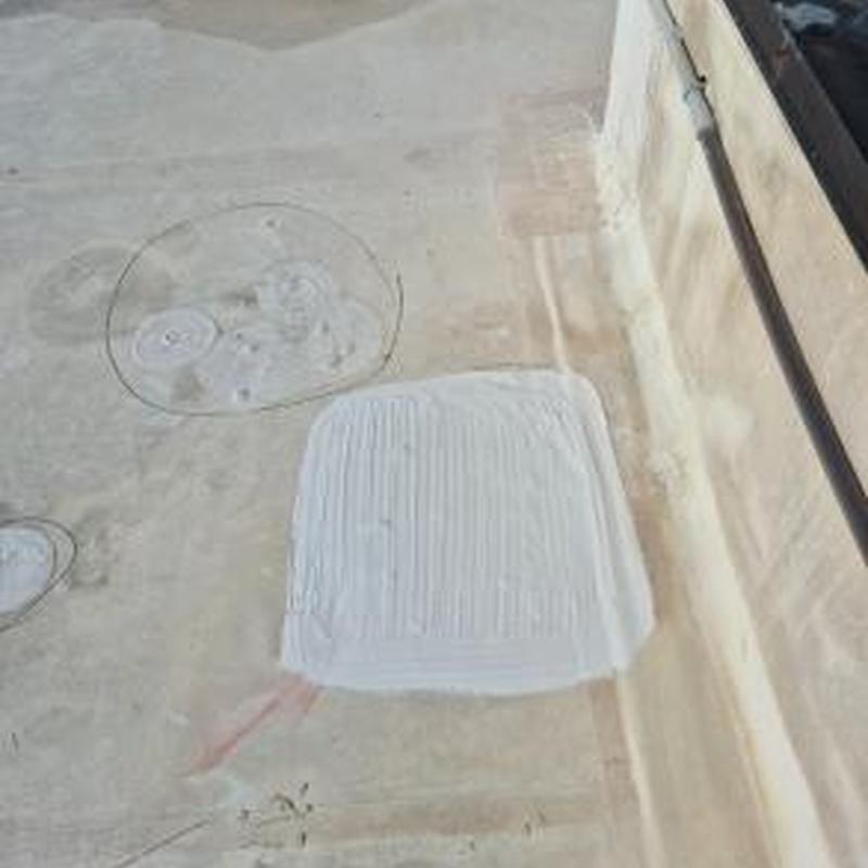 A technician in Greensboro, NC inspected a leaking foam-coated roof. The leak was found near a curb. The technician removed the foam coating and cleaned the area down to the original surface to prepare it for a complete repair and seal.
