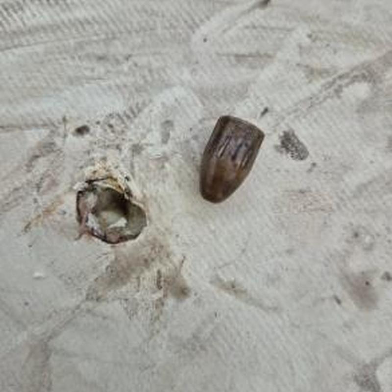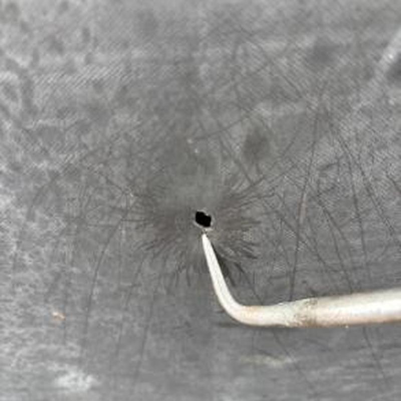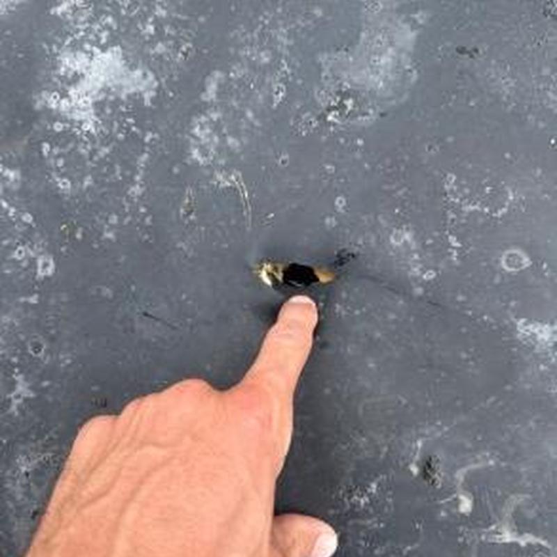 Thompson Roofing Services inspected a leaking roof at a beauty salon in Greensboro, NC. The team identified a bullet hole as the source of the leak. Bullet damage is a common cause of roof leaks in the area. The inspection confirmed the entry point and assessed necessary repair steps.