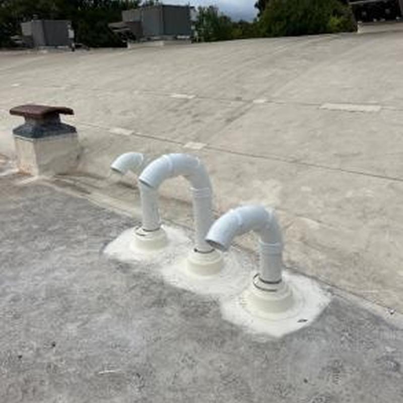Thompson Roofing Services installed new exhaust and vent systems in an existing roof membrane in Durham, North Carolina. This upgrade improved the building's ventilation while maintaining the integrity of the existing roofing structure.
